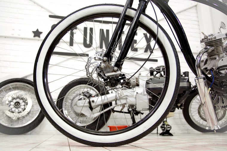Двигатели для велосипедов произовдят только китайцы, и у них в линейке еть несколько моделей. Макс выбрал мотор 80 кубиков, 2-ух тактный с полуавтоматическим сцеплением. Мотор поставляется в комплекте со всем оборудованием необходимым для установки, но это "все" китайское и ужасного качества. Но мотор, не смотря на низкое качество обработки поверхностей, отлично выглядит: имеет правильную форму, красивый блок цилиндра и эстетично вписывается в велосипед. Мы были готовы к доработкам и замене всей навески, поэтому смело купили кит.