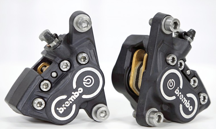 На K1100LT стоят два 4ех поршневых передних суппорта с нестандартным креплением. В нашем проекте мы оставляем стоковые стаканы вилки, а значит замена супортов на новые требует установки дополнительный кронштейнов-переходников. Подобные кронштейны выглядят всегда инородно на мотоцикле, поэтому мы решили почистить и восстановить стоковые суппорты.