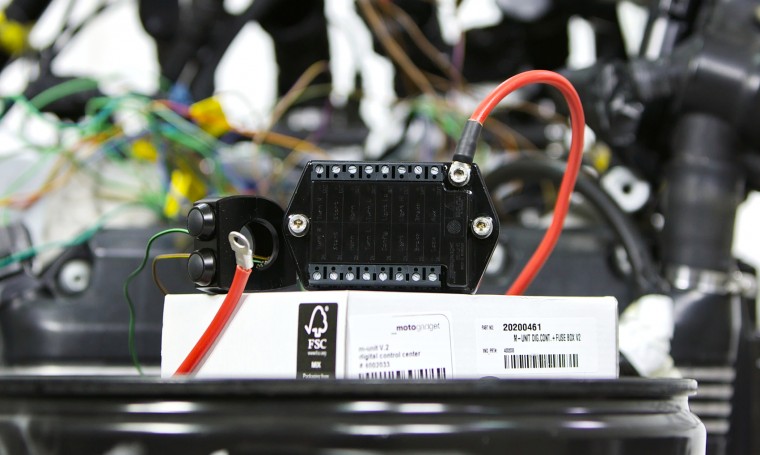 Перед установкой блока на мотоцикл мы решили сначала детально разобраться в схеме подключения и работе устройства совместо с пультами Motogadget. В комплекте есть подробная инструкция, но без эксперимента сложно представить как будет выглядеть проводка с новым блоком управления. Устройство действительно позволило удалить все реле, предохранители и контроллеры, кроме втягивающего реле стартера, реле включения вентилятора (управляется Motronic) и реле зажигания (управляется Motronic).