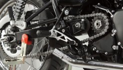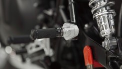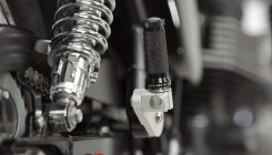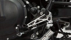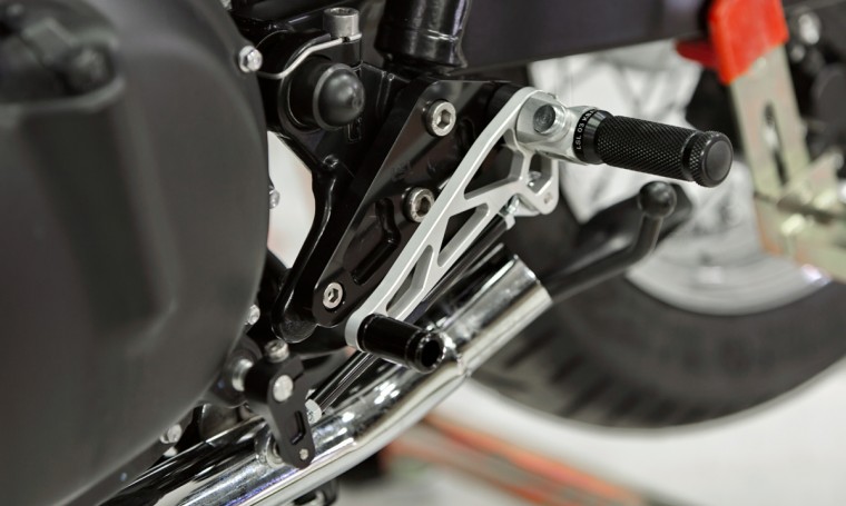 На свой проект мы решили поставить полный комплект немецких подножек LSL, которые адаптированы под каферейсер: лапки смещены на 12см назад и на 3см верх. Цвет выбрали комбинированный, т.к. решили, что полностью черные потеряются на фоне черного двигателя и рамы, а полностью серебристые не будут сочетаться с мотоциклом, т.к. у нас все крупные детали полированные: колеса, фара, выхлопная система. Механизм сгибания лапки с возвратом продается отдельно - штука полезная, но необязательная, при падении сохранит лапку и ее крепление.