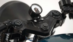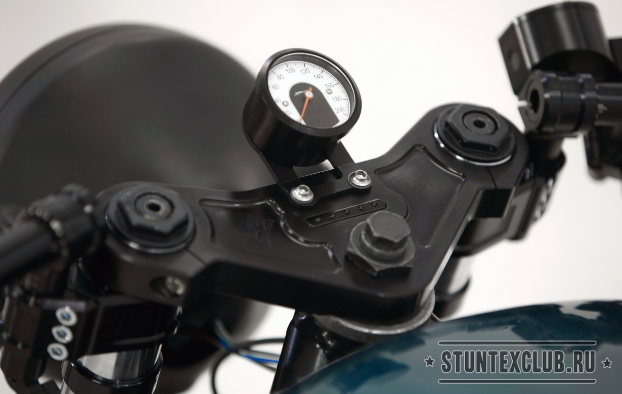При изготовлении траверс рекомендуем сразу предусмотреть все технологические отверстия и посадочные под навеску - потом это будет сложно сделать качественно. Мы решили поставить панель алармов Motosign Mini и приборку Motogadget в алюминиевых корпусах. Лучше использовать самый прочный сплав В95Т. Верхнюю траверсу не стоит делать толстой - рулевая станет менее элегантной, а клипоны будут слишком низко. Гайку и стопорную пробку заменим на новые при финальной сборке.